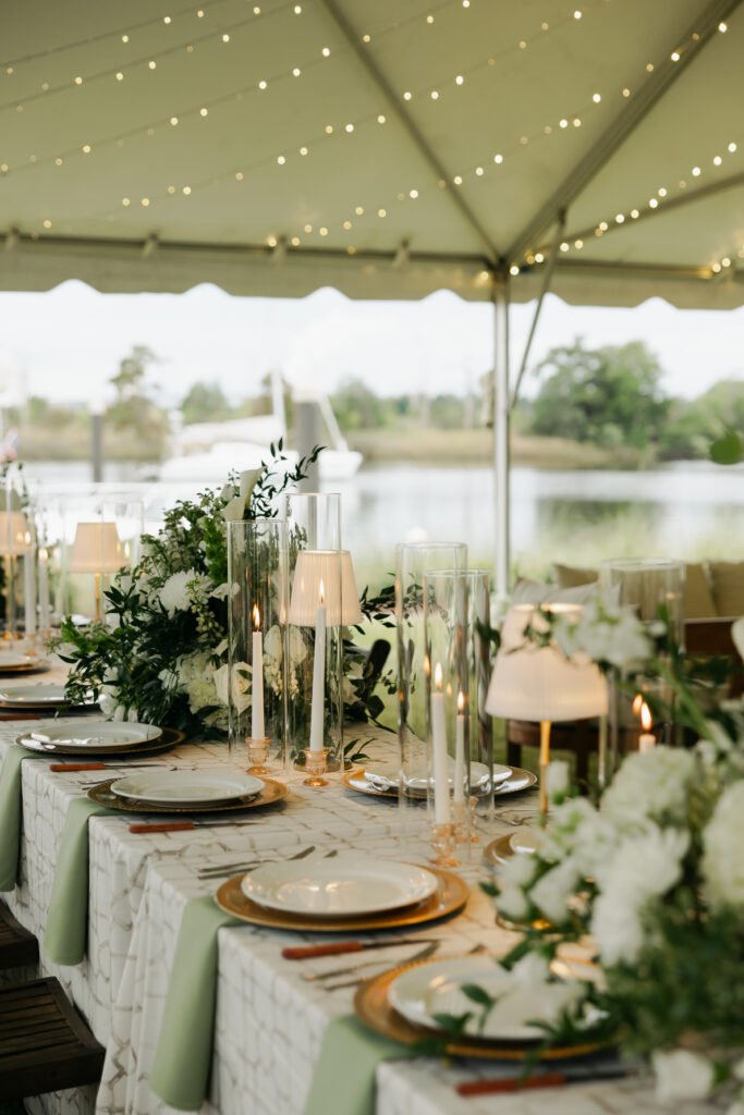 Afterward, guests returned to The George Hotel for a reception that blended timeless style with modern touches. Thoughtful design elements, classic florals, glowing table lamps, and coastal details brought the space to life. It was warm, inviting, and perfectly aligned with Ryan & Kendrick’s vision.